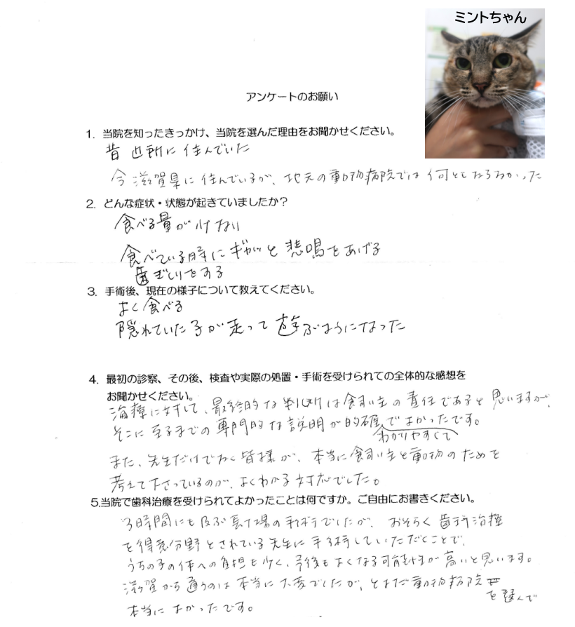 遠方からの通院は大変でしたが、全臼歯抜歯の大手術でしたので本当にとよだ動物病院で診てもらえて良かったです。
