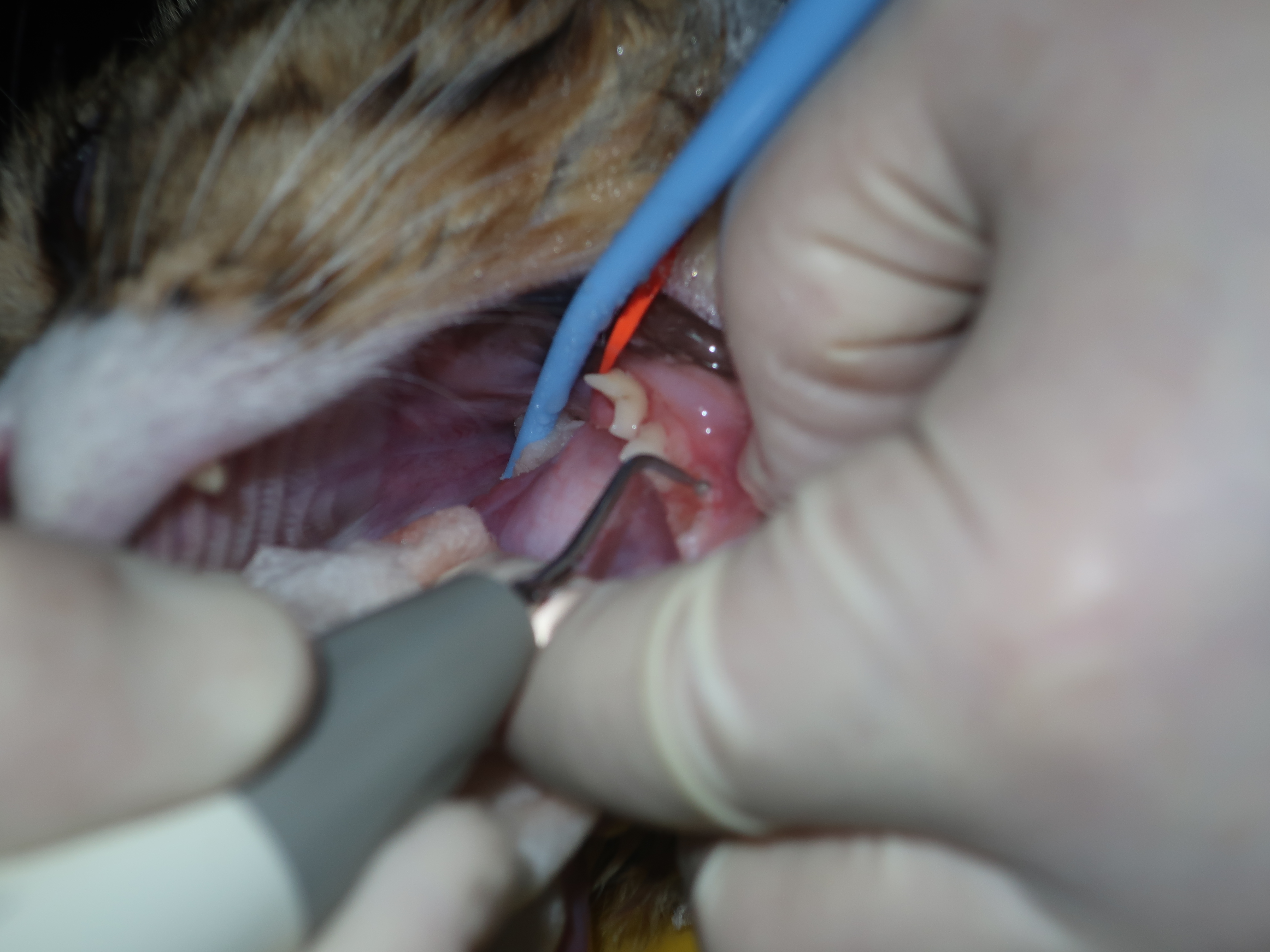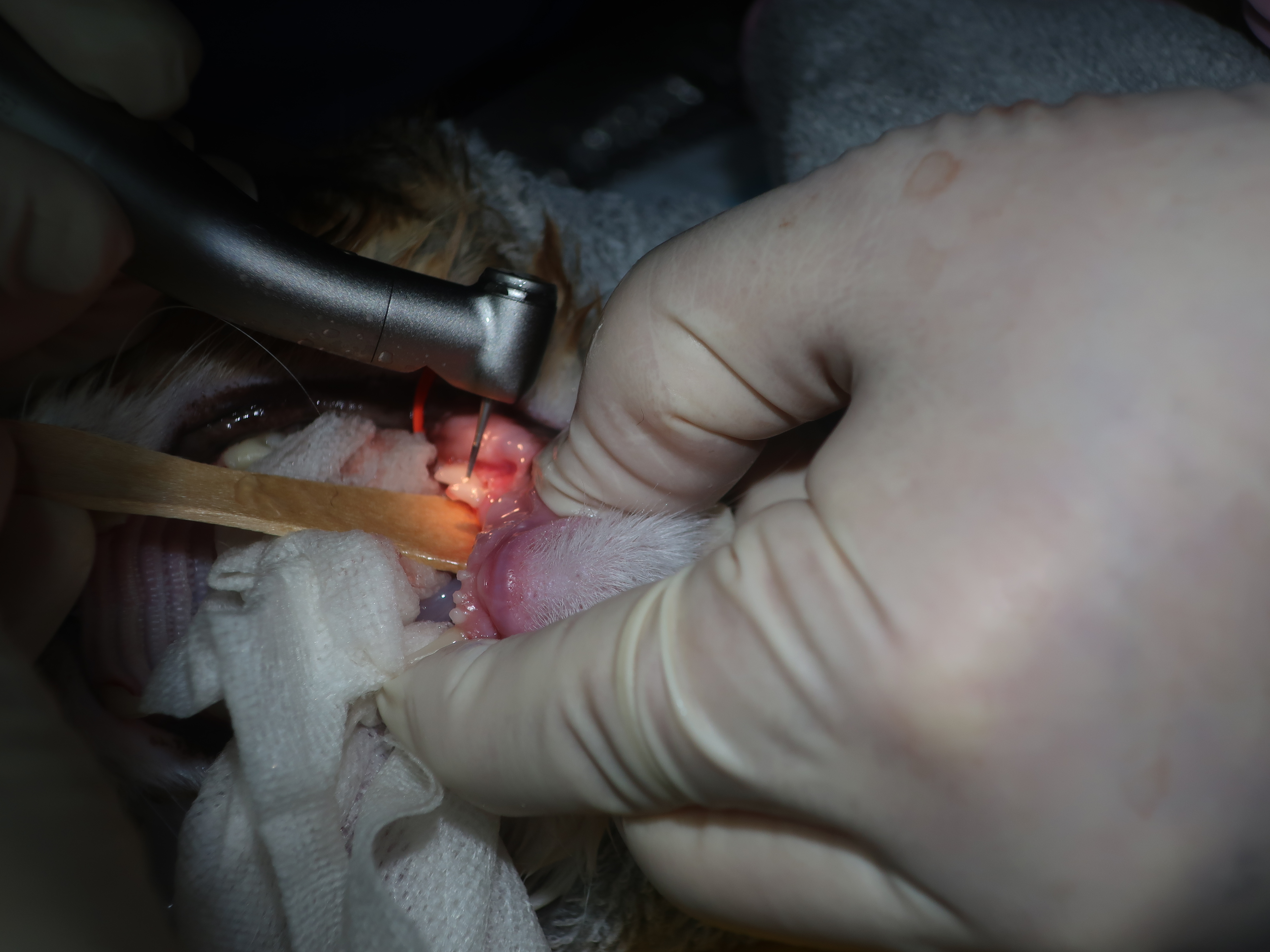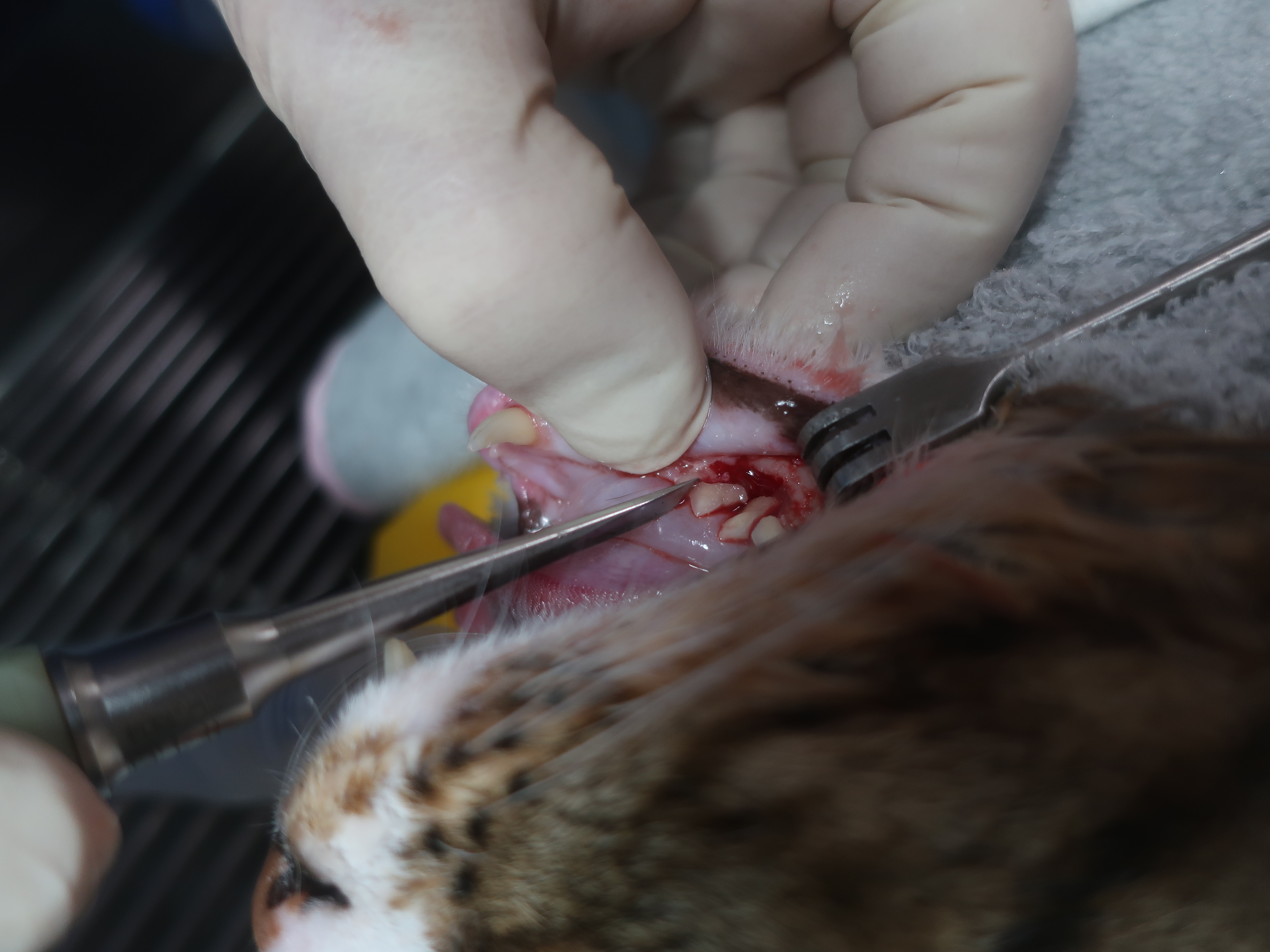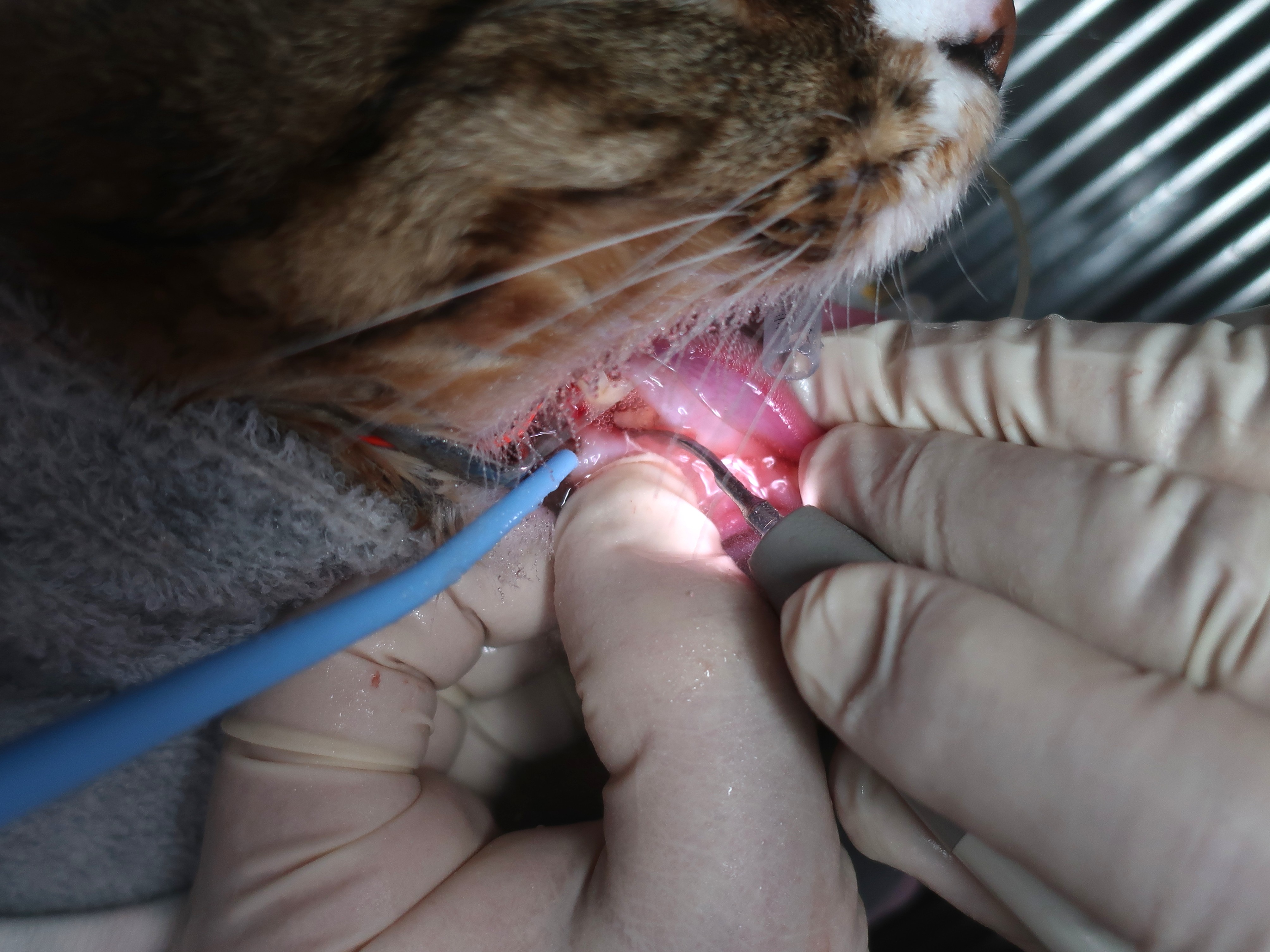 歯が汚れている<歯周病・破歯細胞性吸収病巣>(猫 mix 年令不明)歯科症例186‐② 歯科症例186-①へ 右下顎第2前臼歯と第1後臼歯の抜歯・洗浄・歯肉のトリミング この歯は多根歯ですので、分割してから抜歯を行いました。。 左下顎第1前臼歯の歯冠切除・洗浄・トリミング・縫合 ルートプレーニング ポリッシング 歯科用軟膏の注入 →当院の歯科処置について詳しくはこちらをご覧ください。 歯科症例186-③へ