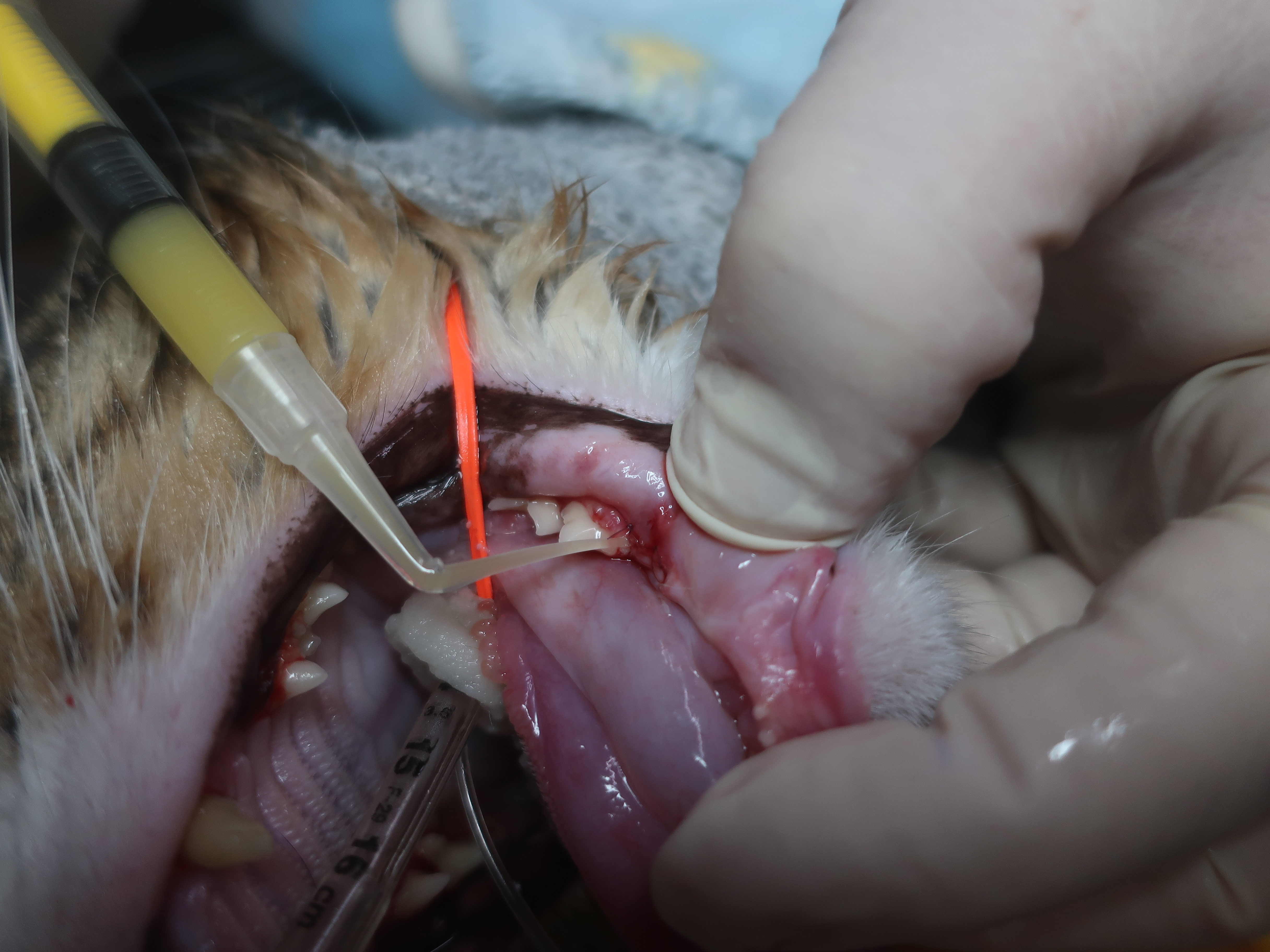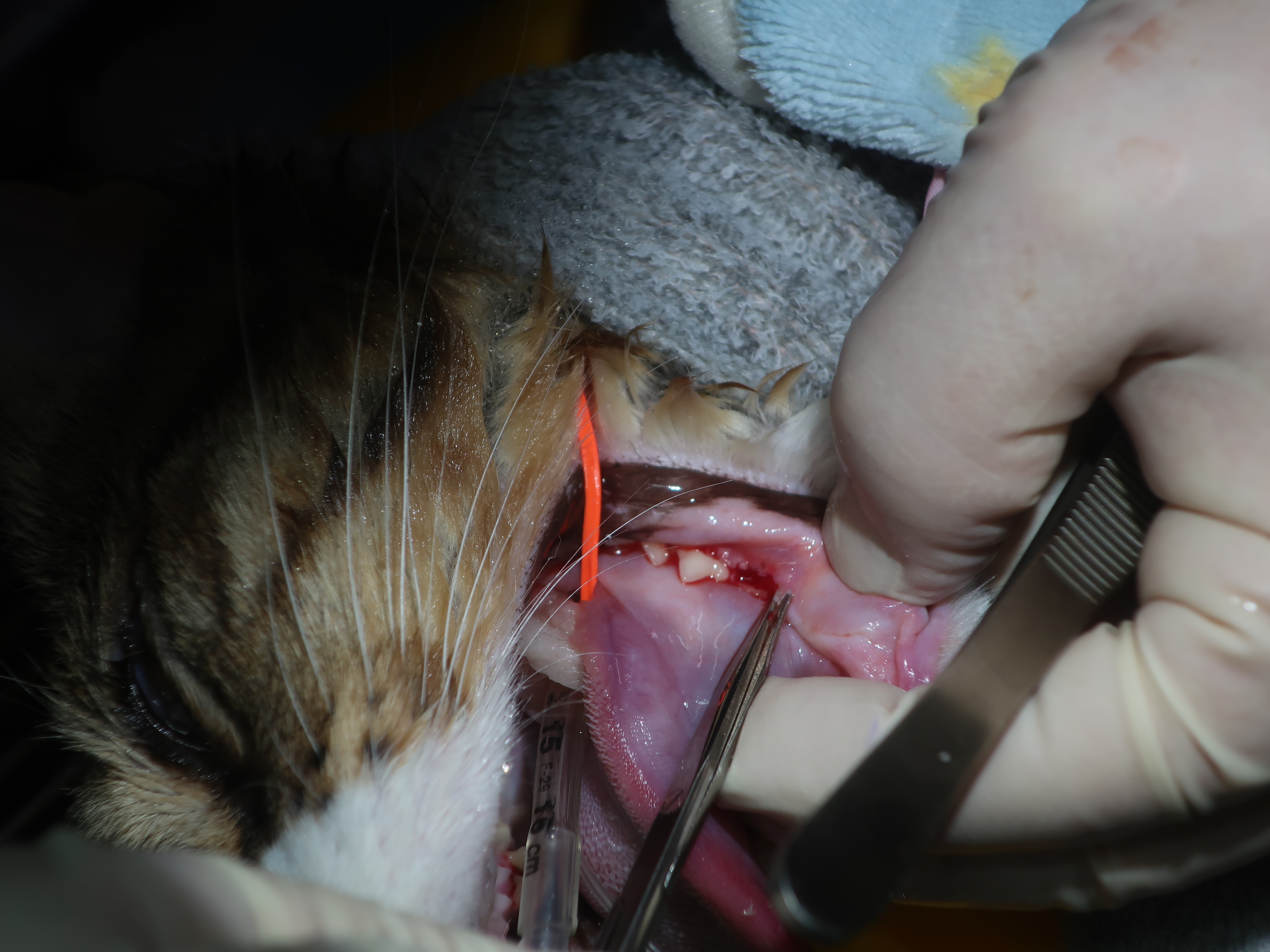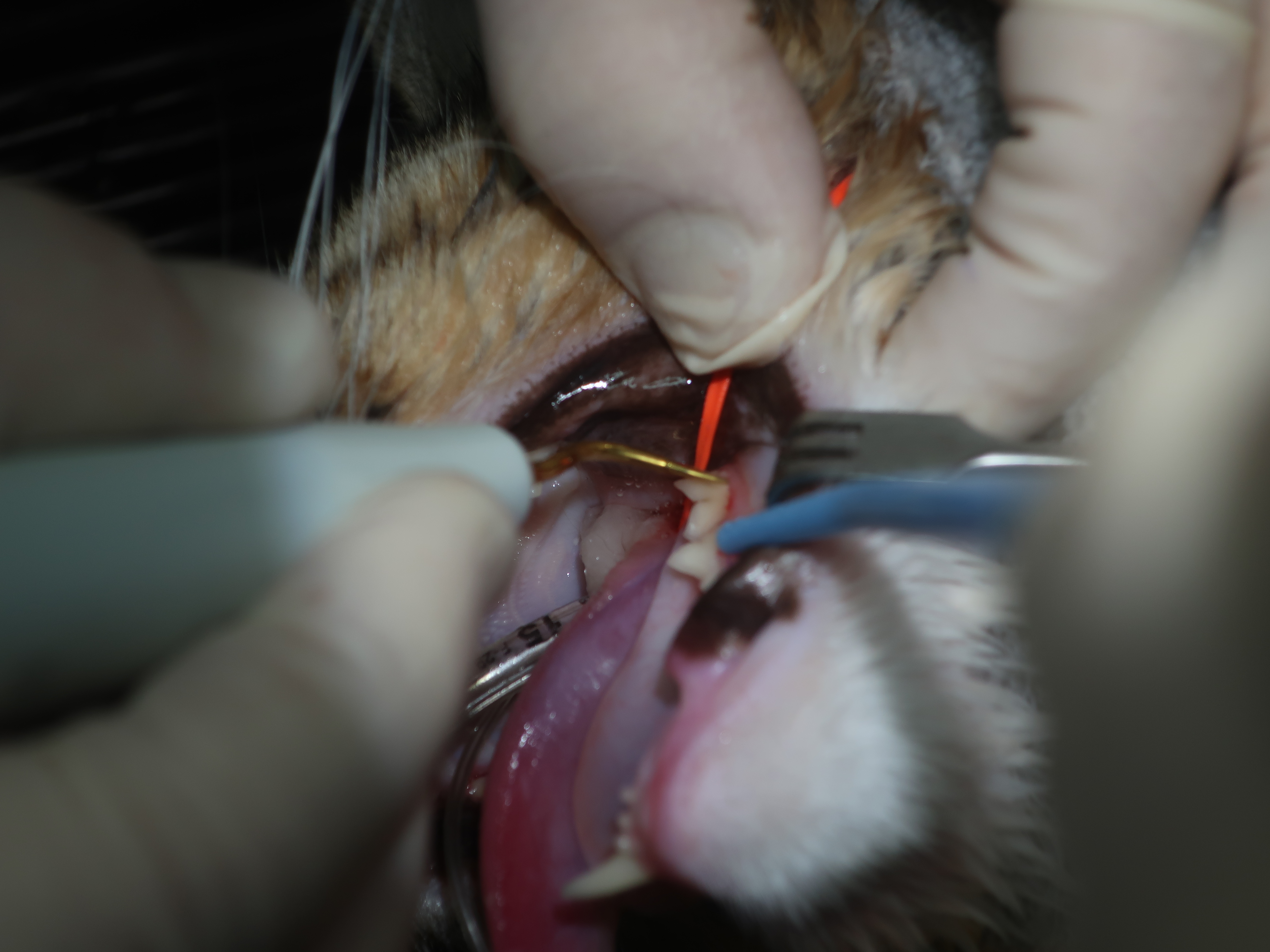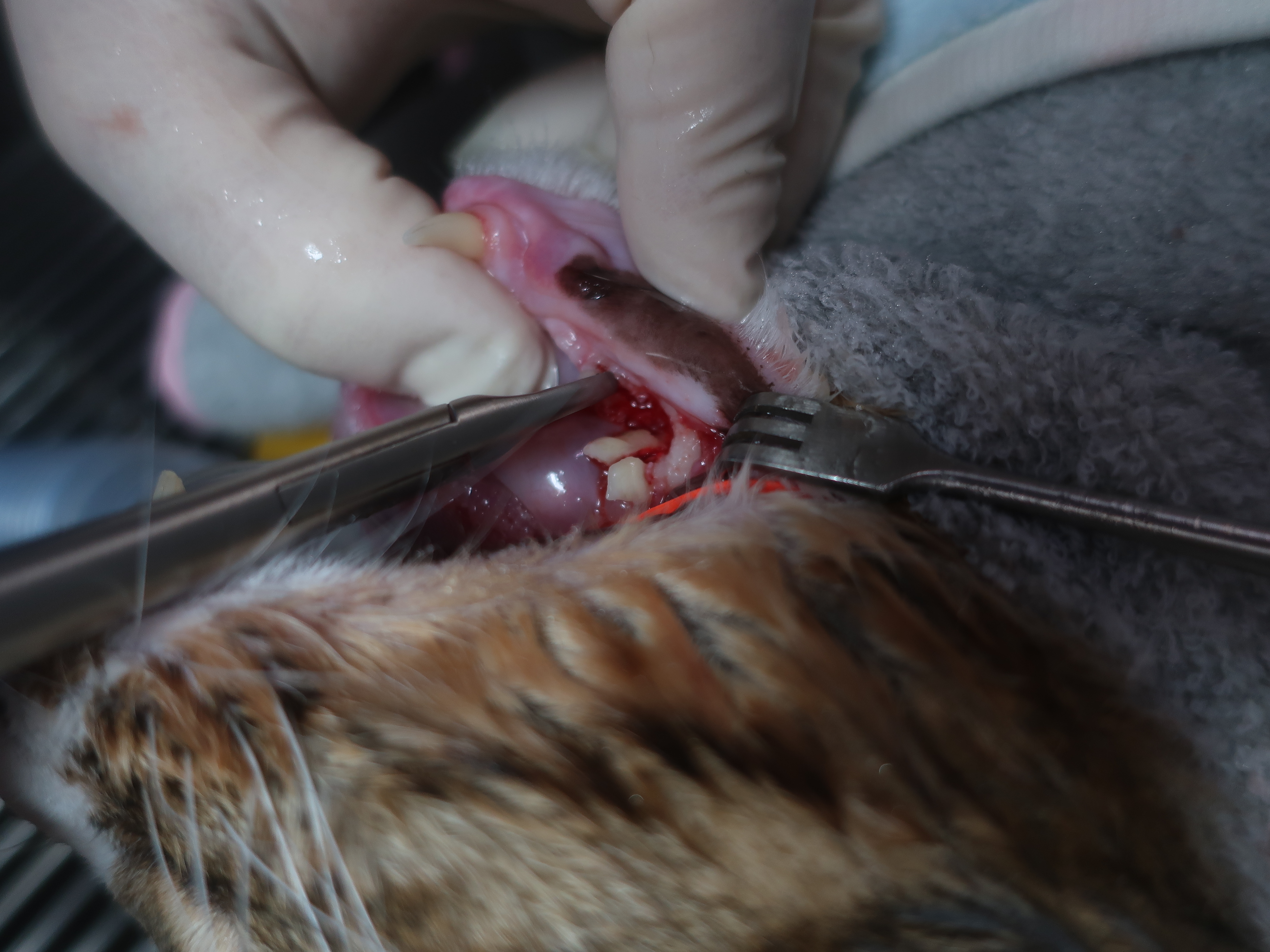 歯が汚れている<歯周病・破歯細胞性吸収病巣>(猫 mix 年令不明)歯科症例186‐② 歯科症例186-①へ 右下顎第2前臼歯と第1後臼歯の抜歯・洗浄・歯肉のトリミング この歯は多根歯ですので、分割してから抜歯を行いました。。 左下顎第1前臼歯の歯冠切除・洗浄・トリミング・縫合 ルートプレーニング ポリッシング 歯科用軟膏の注入 →当院の歯科処置について詳しくはこちらをご覧ください。 歯科症例186-③へ