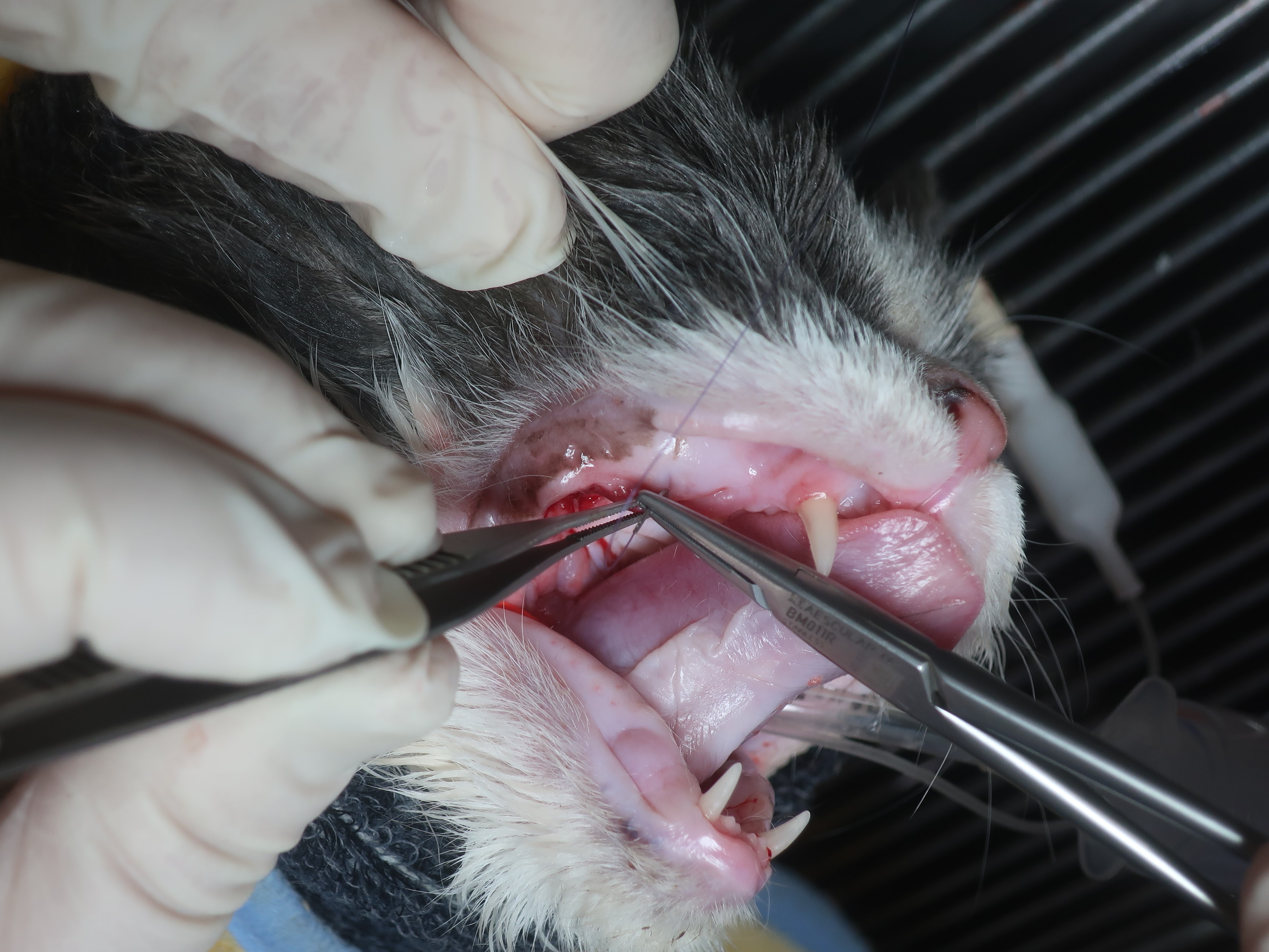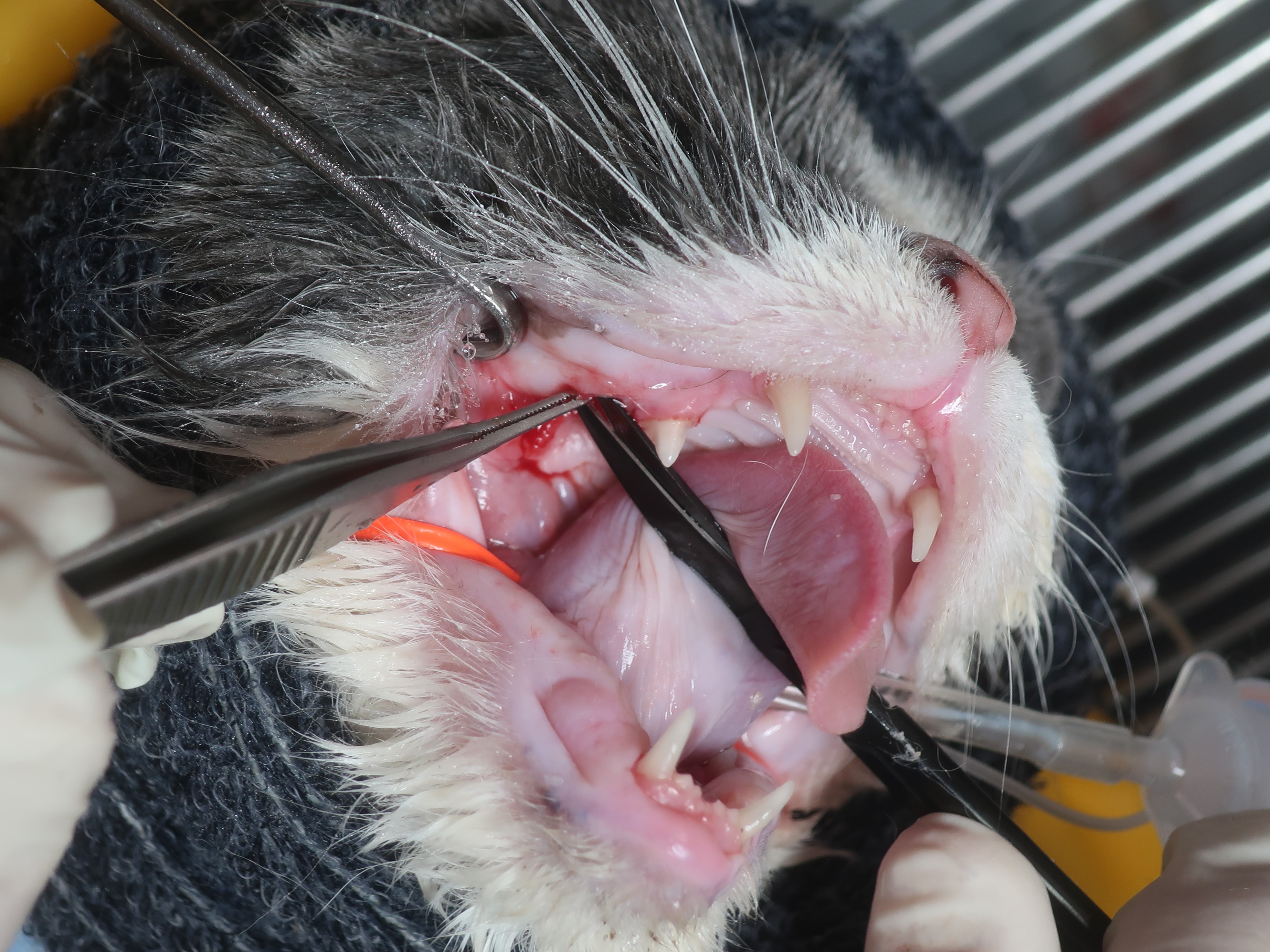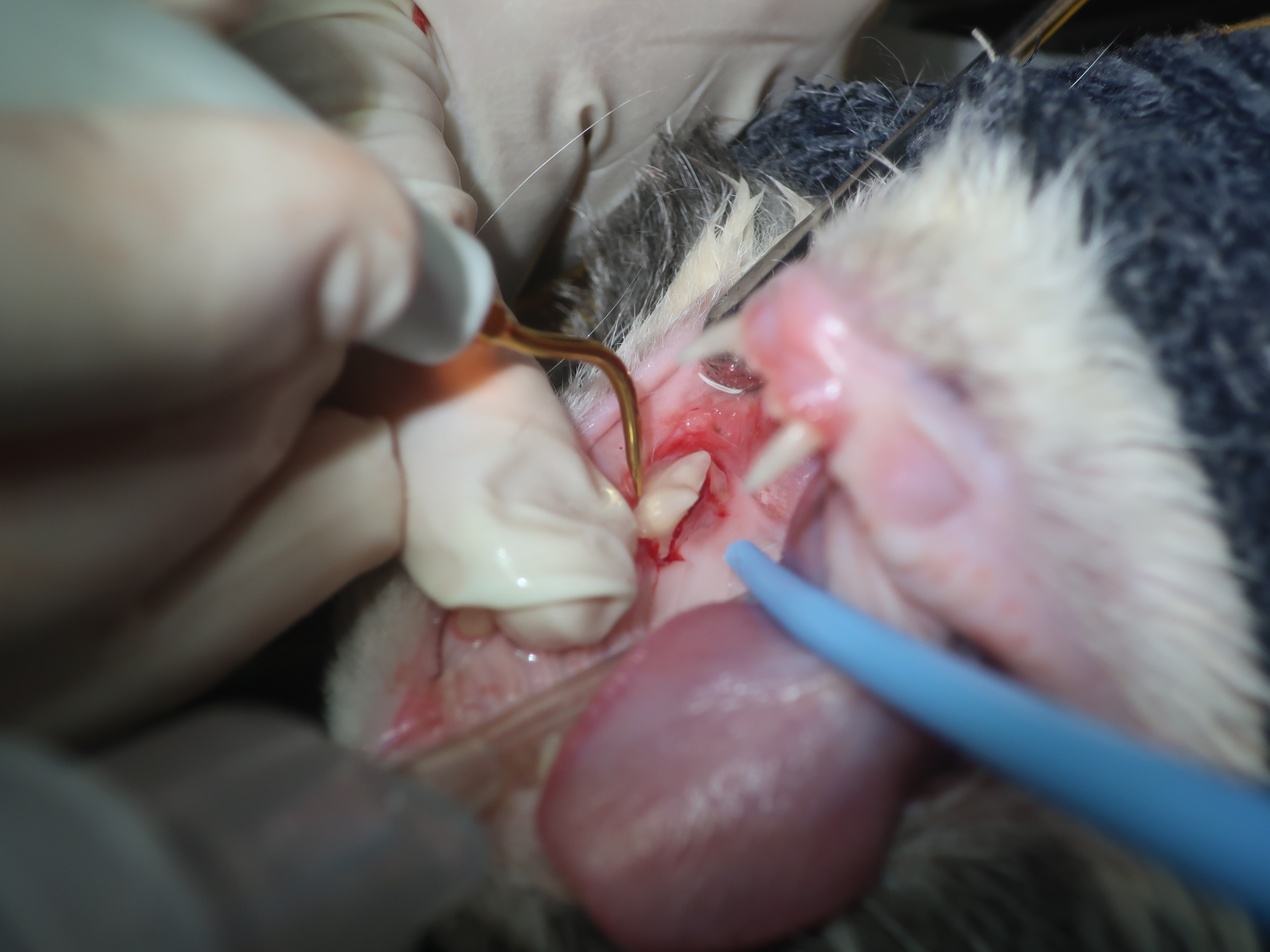 口臭・ヨダレがあり口を痛そうにしている<破歯細胞性吸収病巣・歯周病>(ブリティッシュショートヘア 8才)歯科症例180-② 歯科症例180-①へ 右上顎第3前臼歯の抜歯・洗浄・縫合 左右下顎第1後臼歯も同様に抜歯を行いました。 左右下顎第3前臼歯は歯冠切除を行いました。 ルートプレーニング ポリッシング 歯科用軟膏の注入 →当院の歯科処置について詳しくはこちらをご覧ください。 歯科症例180-③へ
