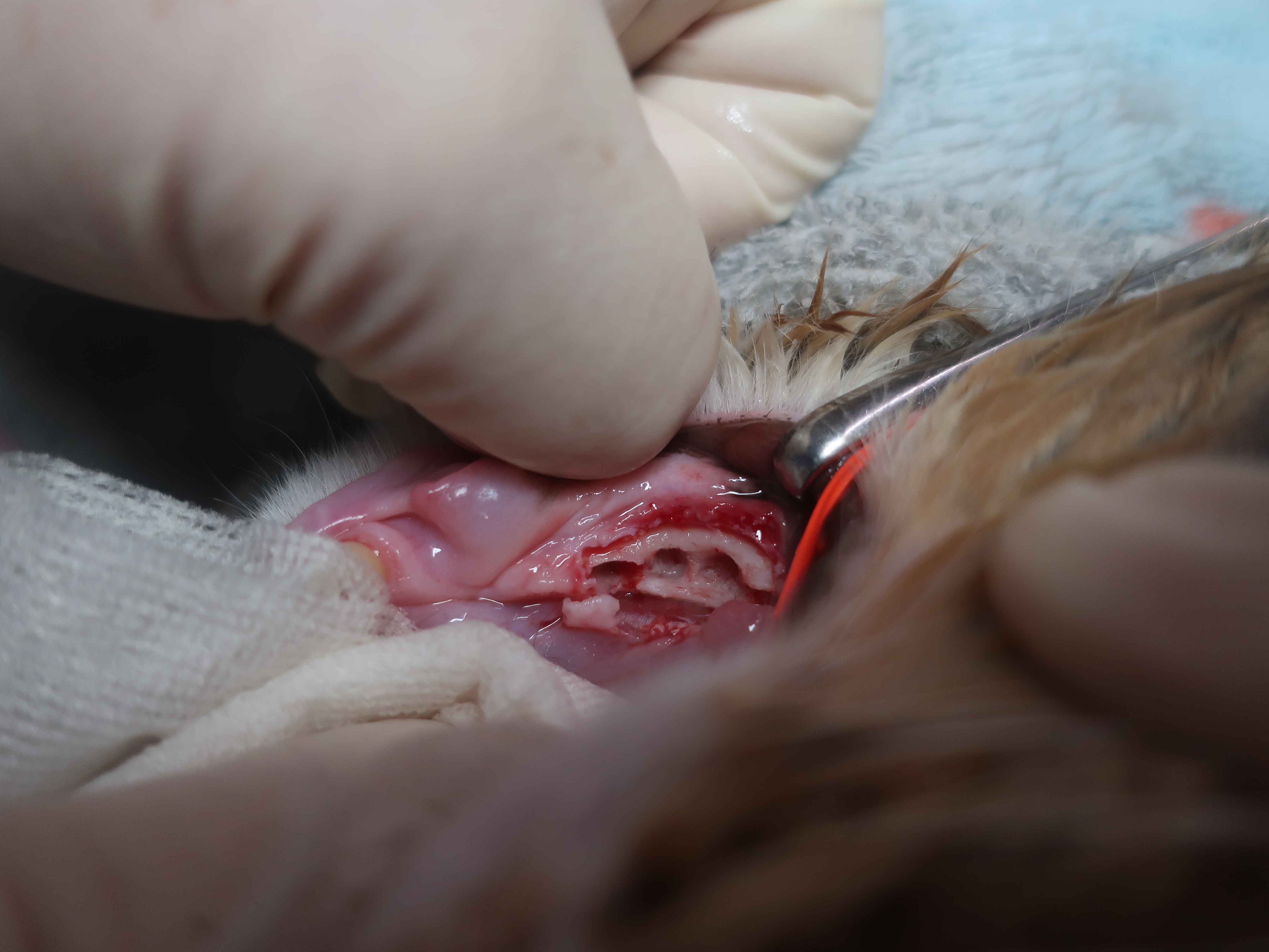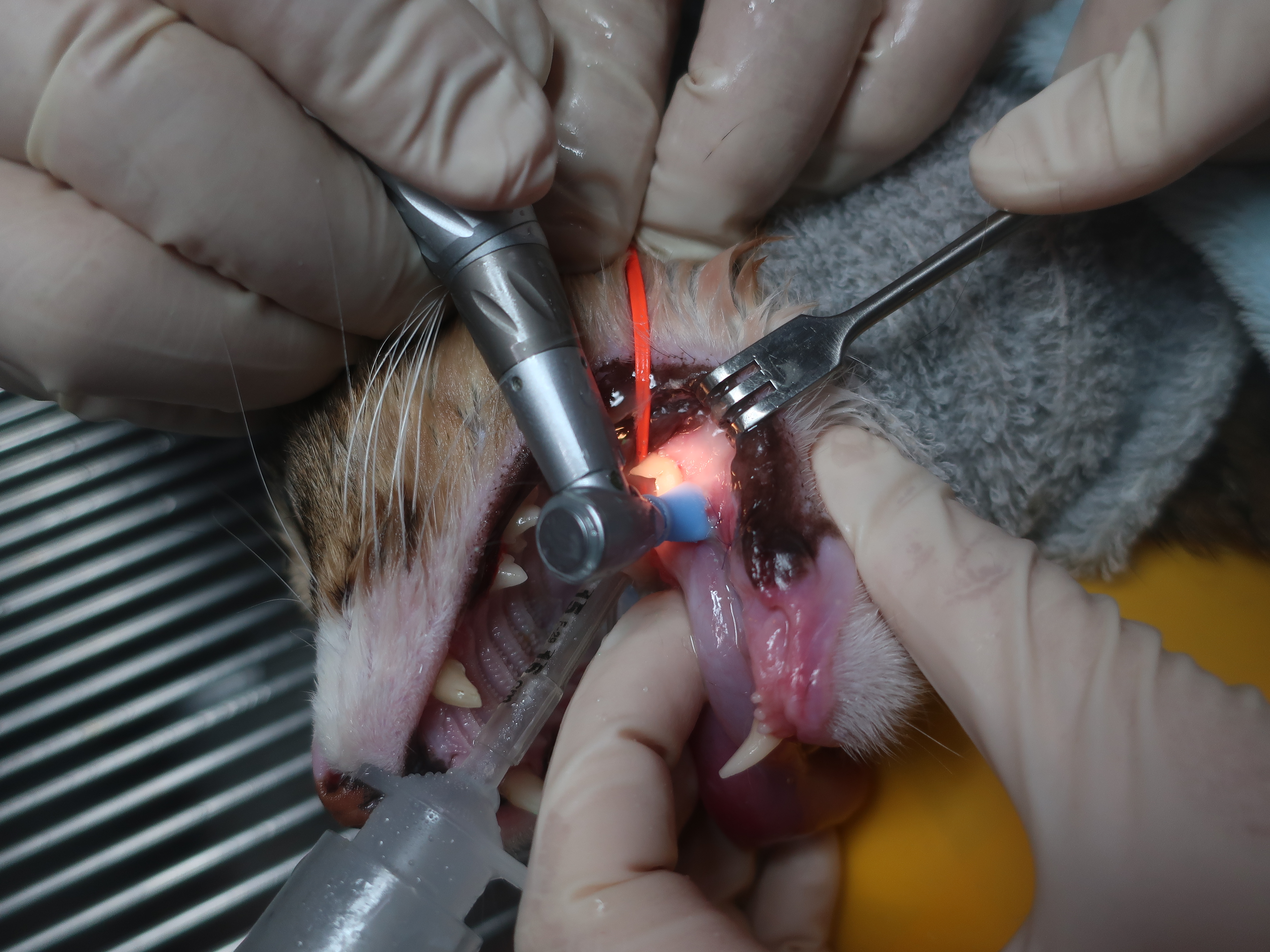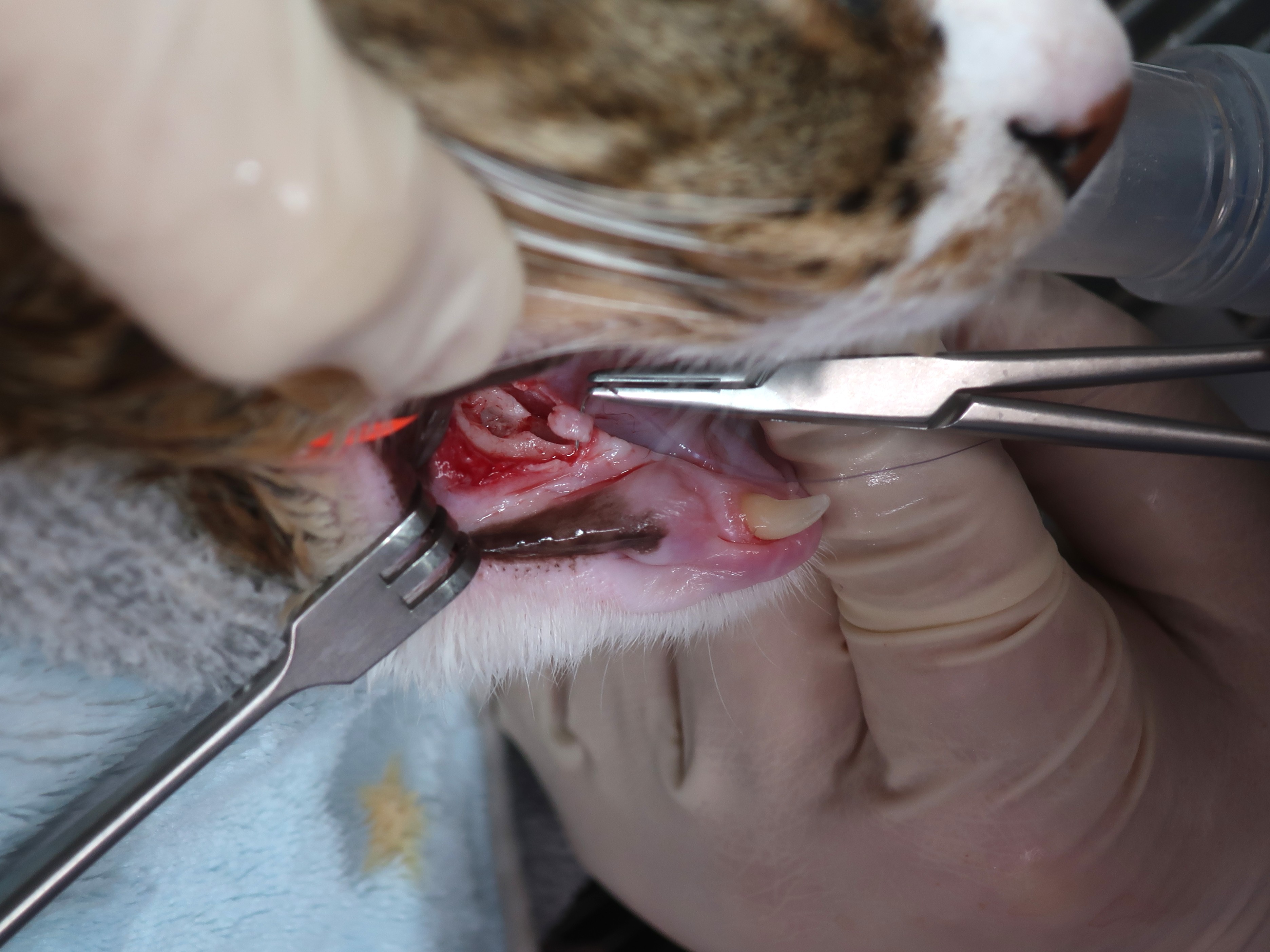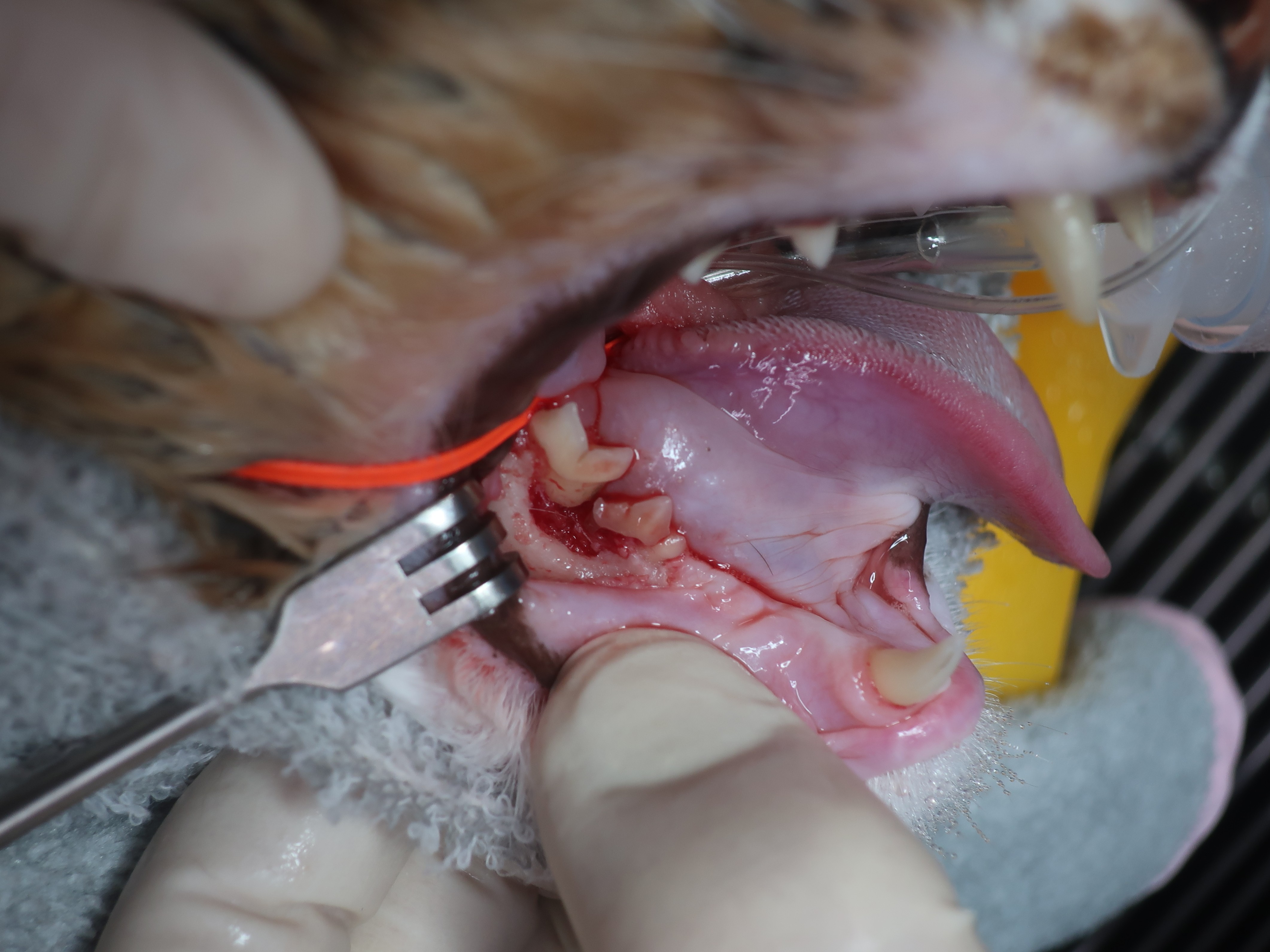歯が汚れている<歯周病・破歯細胞性吸収病巣>(猫 mix 年令不明)歯科症例186‐② 歯科症例186-①へ 右下顎第2前臼歯と第1後臼歯の抜歯・洗浄・歯肉のトリミング この歯は多根歯ですので、分割してから抜歯を行いました。。 左下顎第1前臼歯の歯冠切除・洗浄・トリミング・縫合 ルートプレーニング ポリッシング 歯科用軟膏の注入 →当院の歯科処置について詳しくはこちらをご覧ください。 歯科症例186-③へ