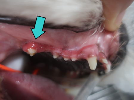 (写真は歯科処置時)青矢印部分の歯肉の発赤が確認出来ます。