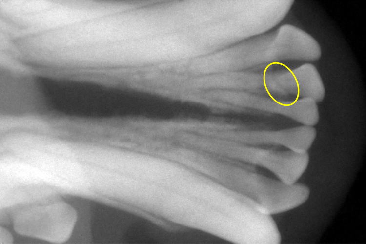 右下顎第2切歯が歯根破折していました。(黄色〇部分)