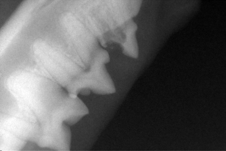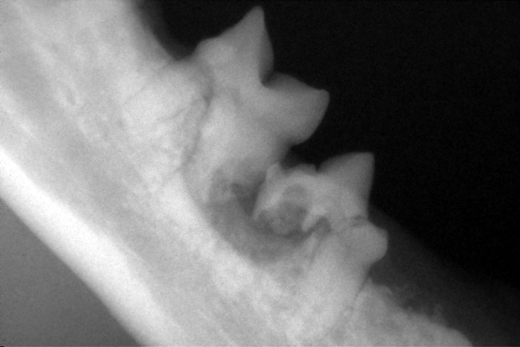 左下顎第1後臼歯は歯根がアンキローシス(骨性癒着)を起こしていましたので歯冠切除を行いました。
