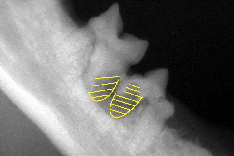 左下顎第1後臼歯も破歯細胞性吸収病巣により歯冠と歯根の一部が溶けていました。(歯色斜線部分)