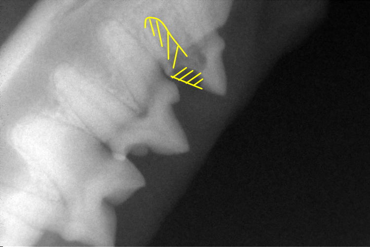破歯細胞性吸収病巣により、歯根の一部が溶けていることが確認できます。(黄色斜線部分)