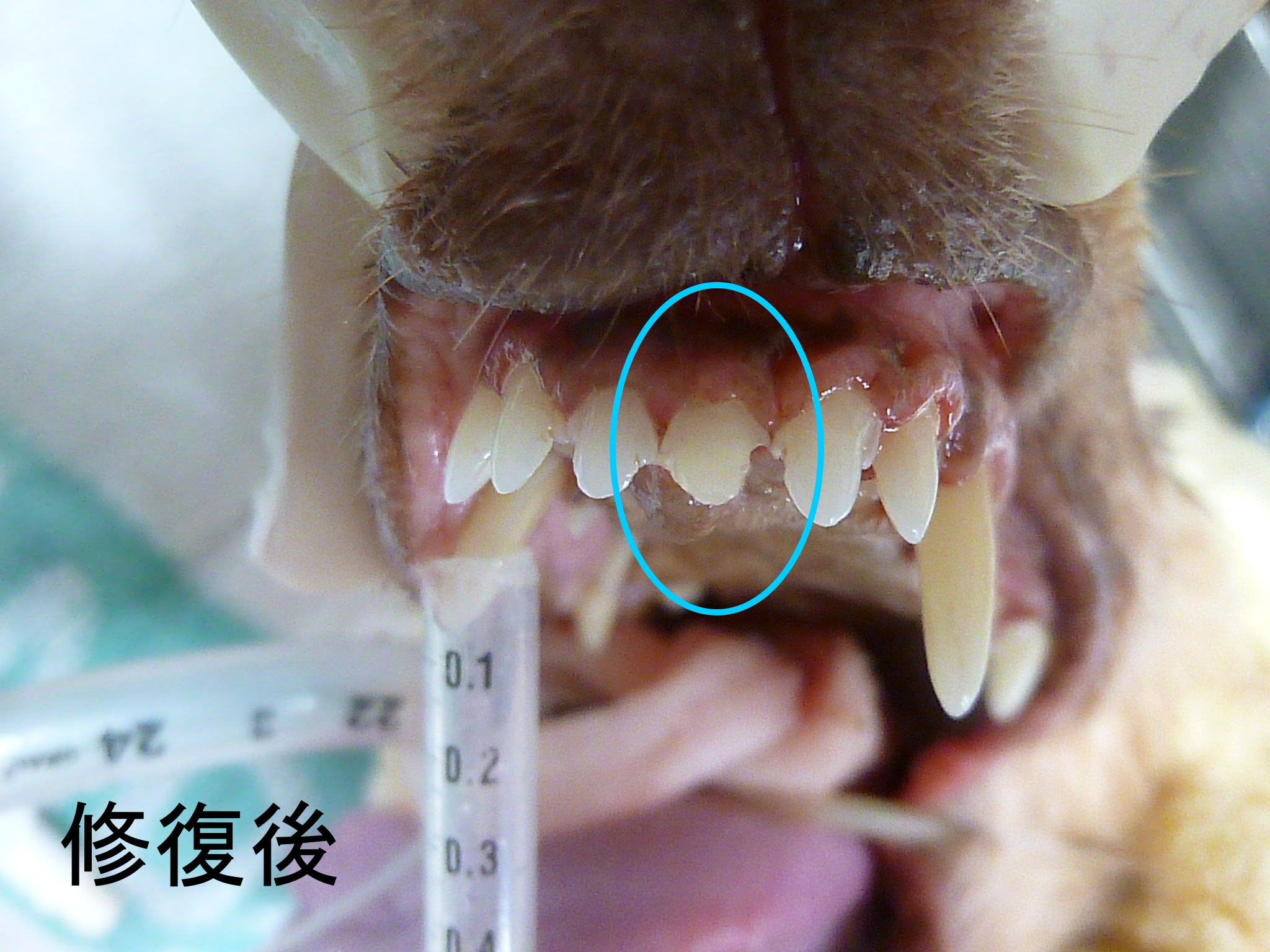左上顎第1切歯は破折していましたが、露髄はしていないと判断し、歯冠修復処置を行いました。