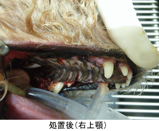 最後に、歯周ポケットが深かった部分には歯科用軟膏を注入し、処置を終了しました。