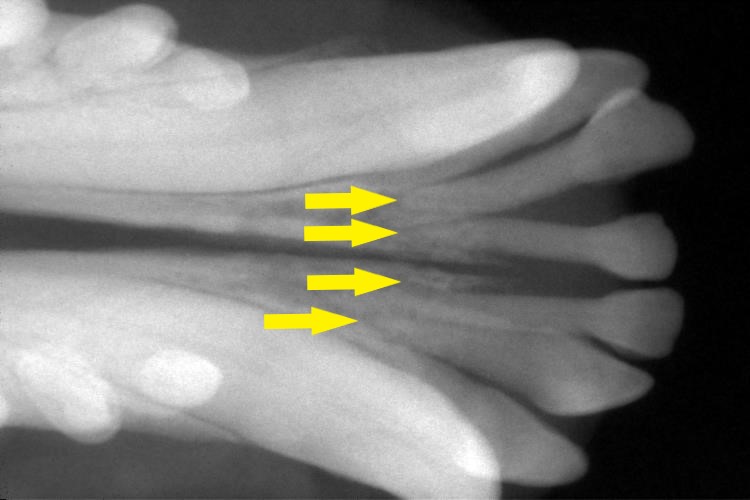 歯周病により歯槽骨が溶けてしまい、黄色矢印切歯がぐらついていました。
