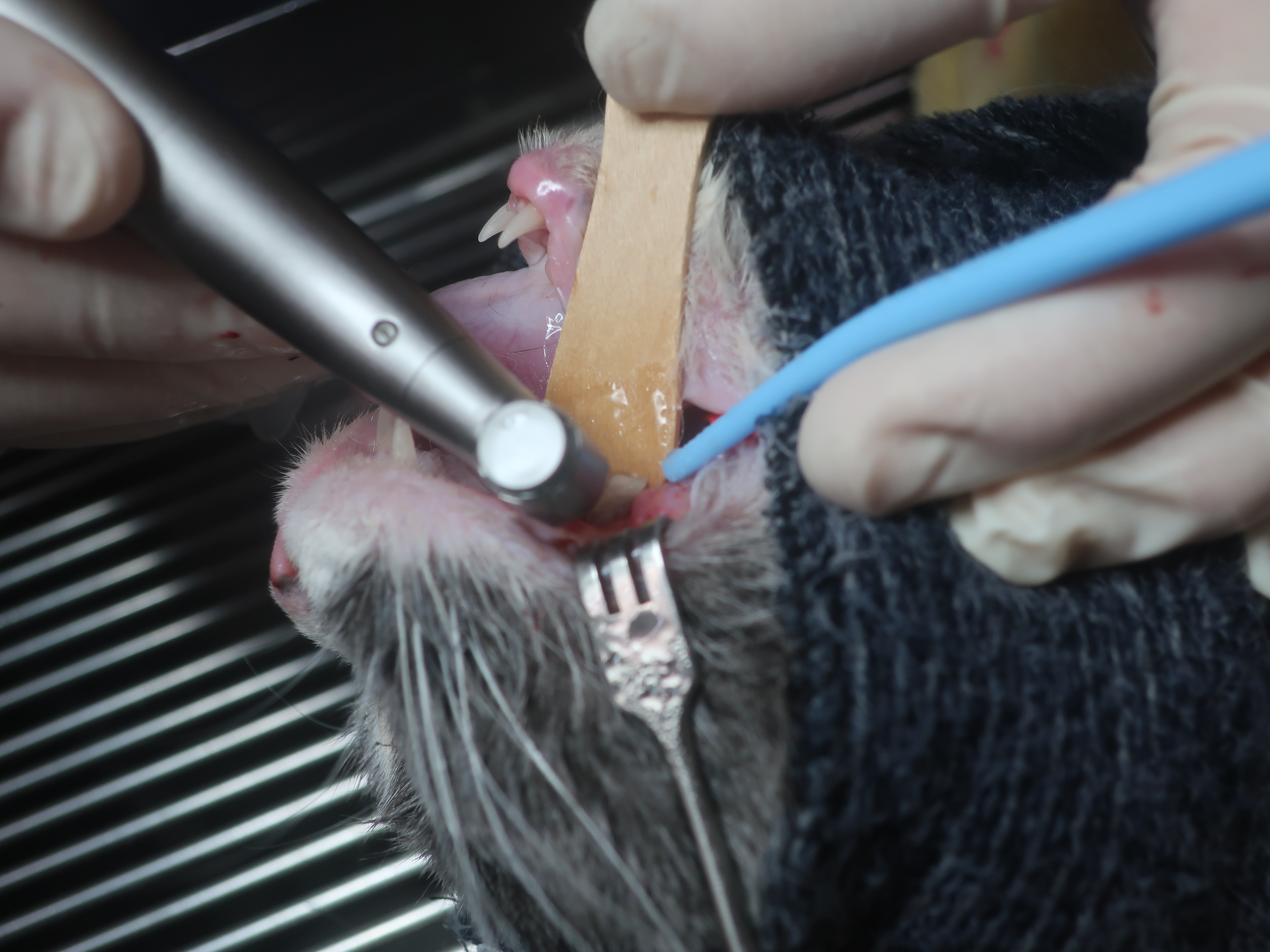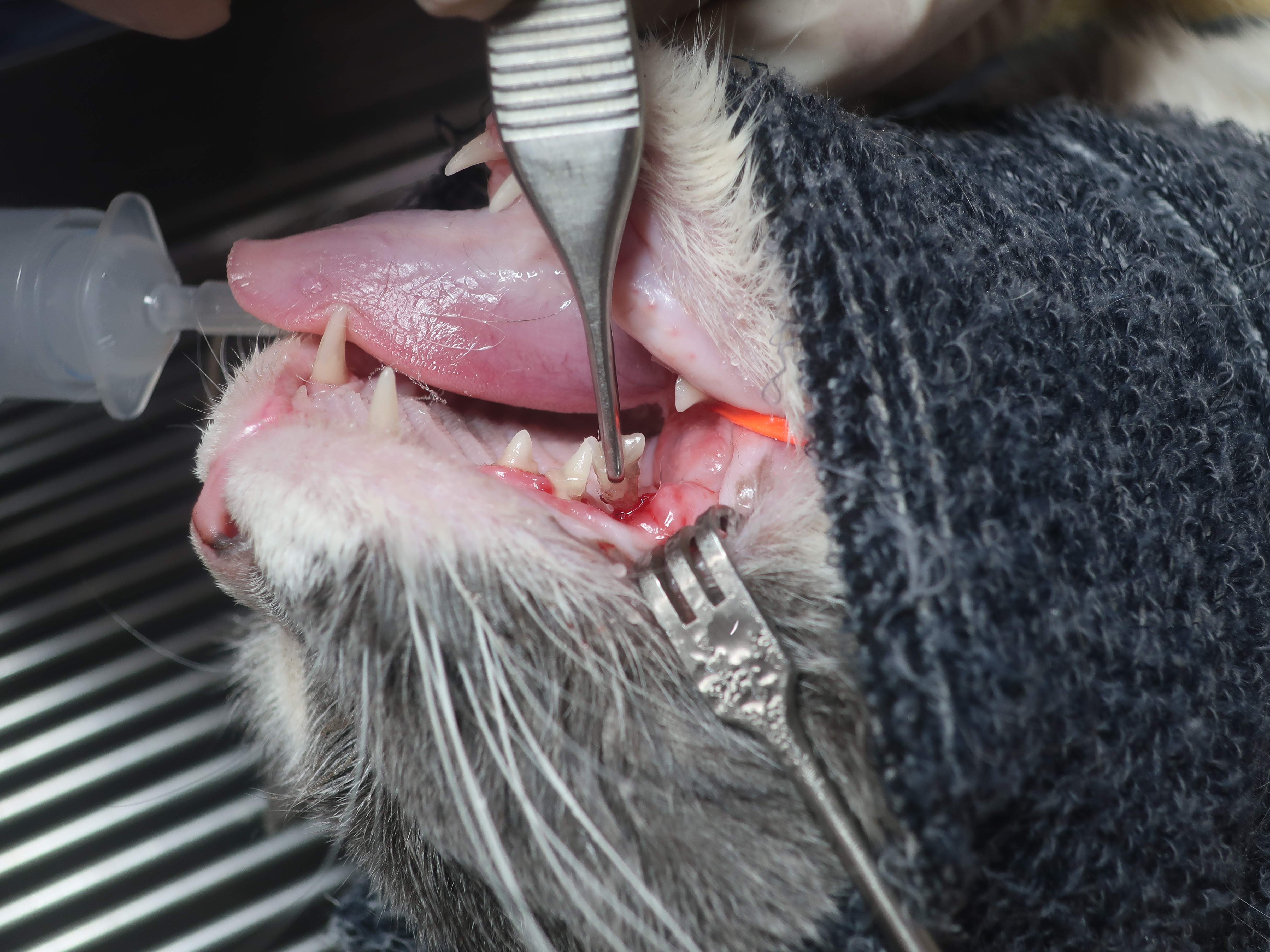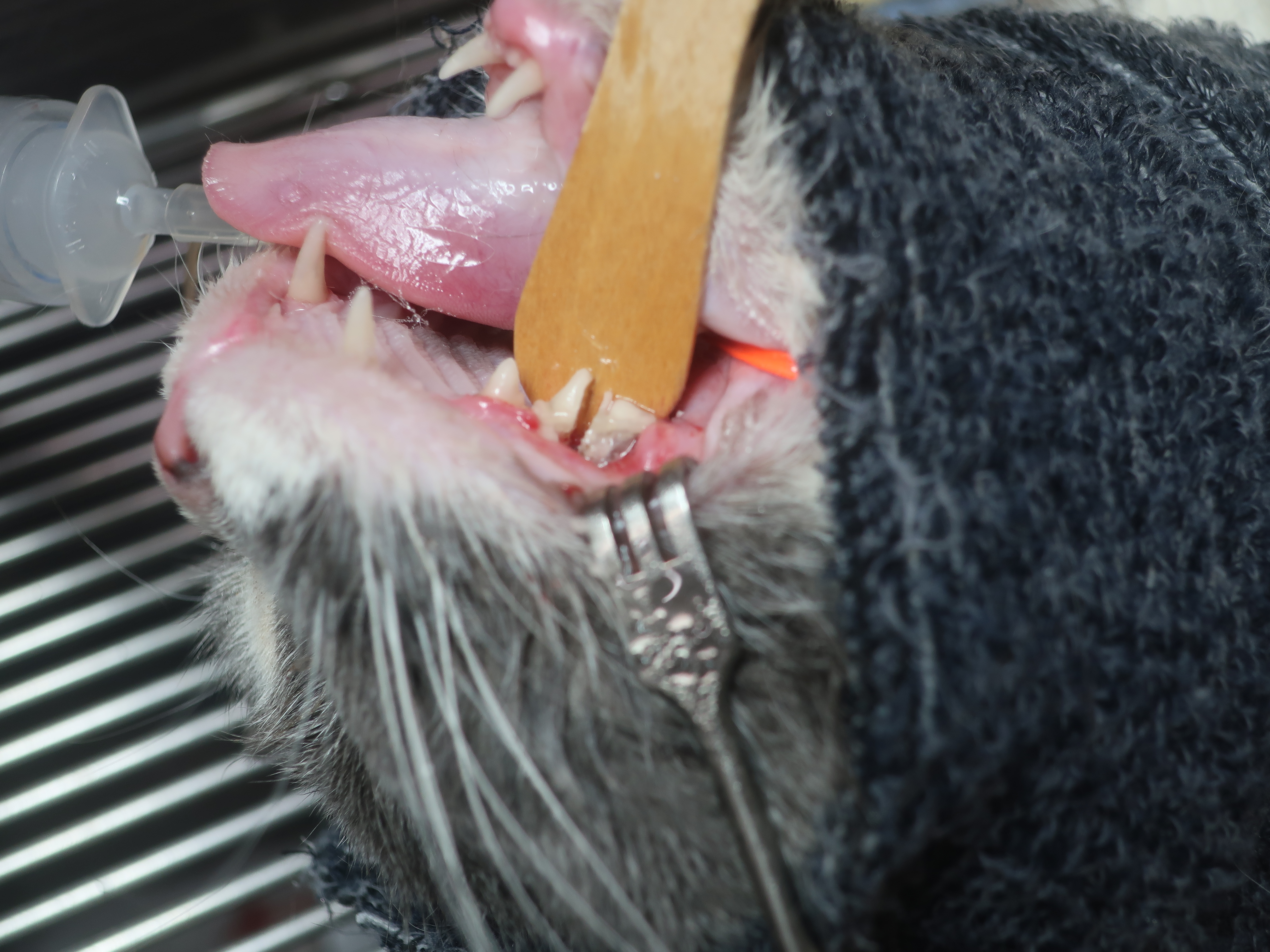 口臭・ヨダレがあり口を痛そうにしている<破歯細胞性吸収病巣・歯周病>(ブリティッシュショートヘア 8才)歯科症例180-② 歯科症例180-①へ 右上顎第3前臼歯の抜歯・洗浄・縫合 左右下顎第1後臼歯も同様に抜歯を行いました。 左右下顎第3前臼歯は歯冠切除を行いました。 ルートプレーニング ポリッシング 歯科用軟膏の注入 →当院の歯科処置について詳しくはこちらをご覧ください。 歯科症例180-③へ
