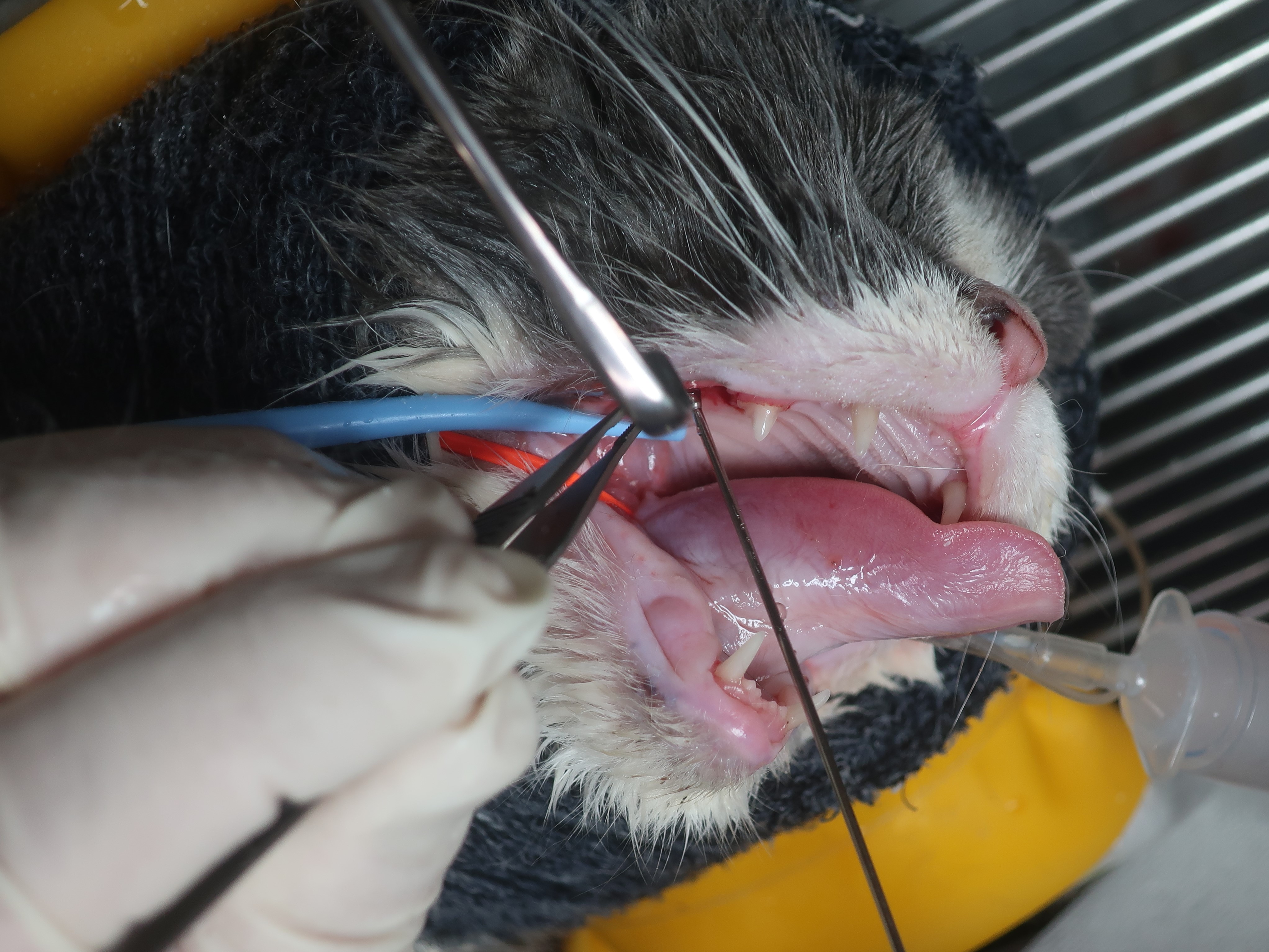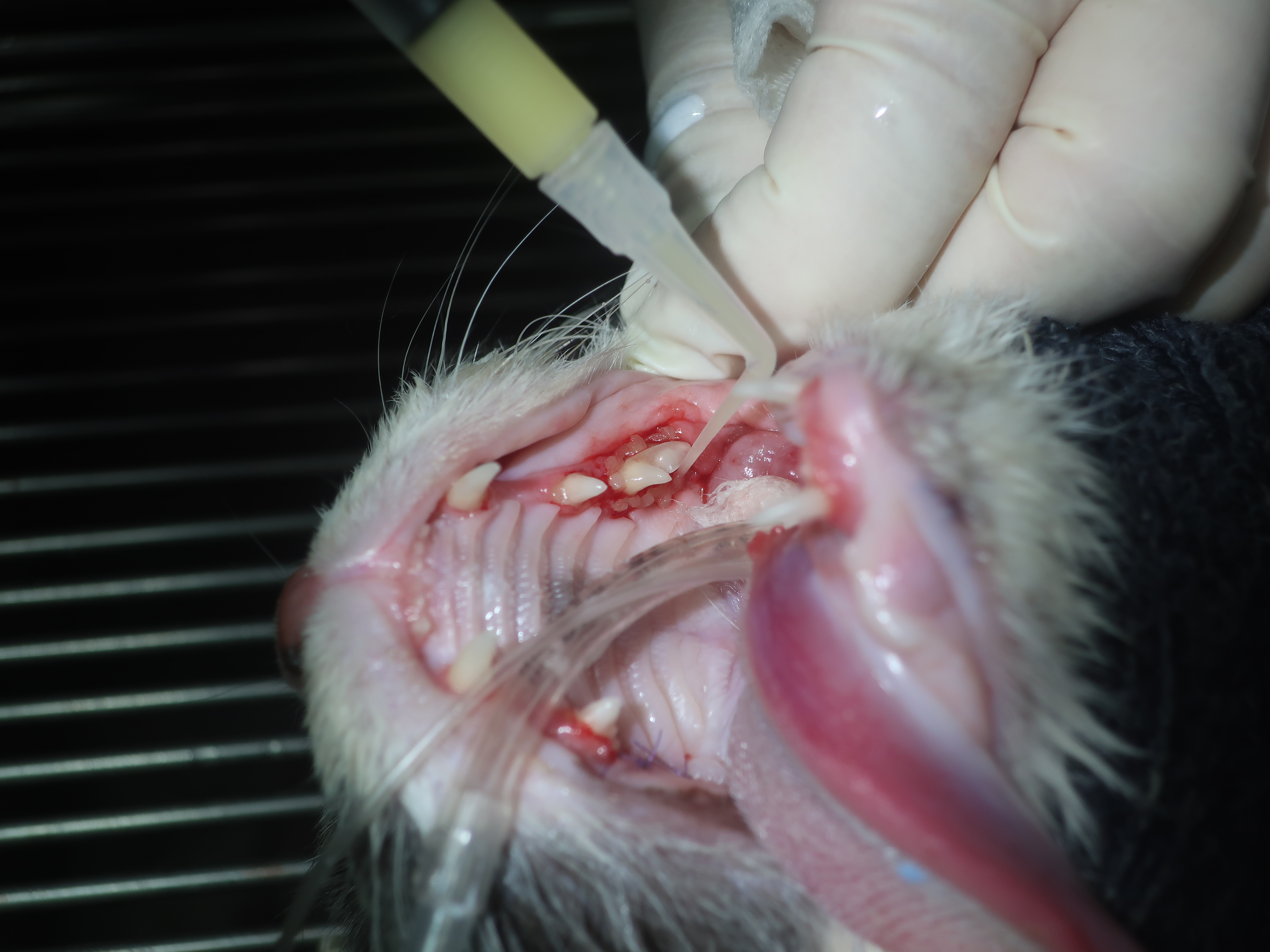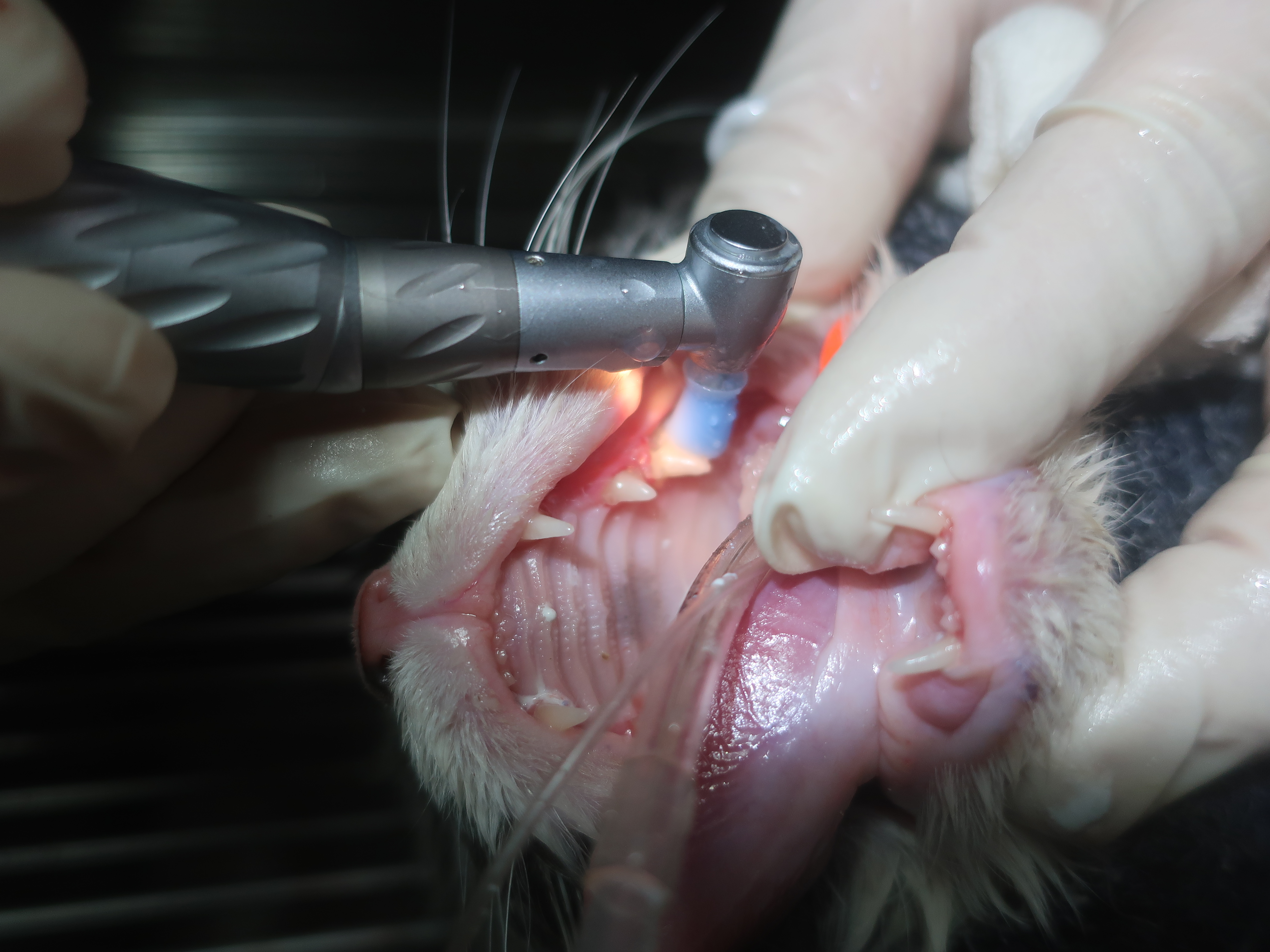 口臭・ヨダレがあり口を痛そうにしている<破歯細胞性吸収病巣・歯周病>(ブリティッシュショートヘア 8才)歯科症例180-② 歯科症例180-①へ 右上顎第3前臼歯の抜歯・洗浄・縫合 左右下顎第1後臼歯も同様に抜歯を行いました。 左右下顎第3前臼歯は歯冠切除を行いました。 ルートプレーニング ポリッシング 歯科用軟膏の注入 →当院の歯科処置について詳しくはこちらをご覧ください。 歯科症例180-③へ